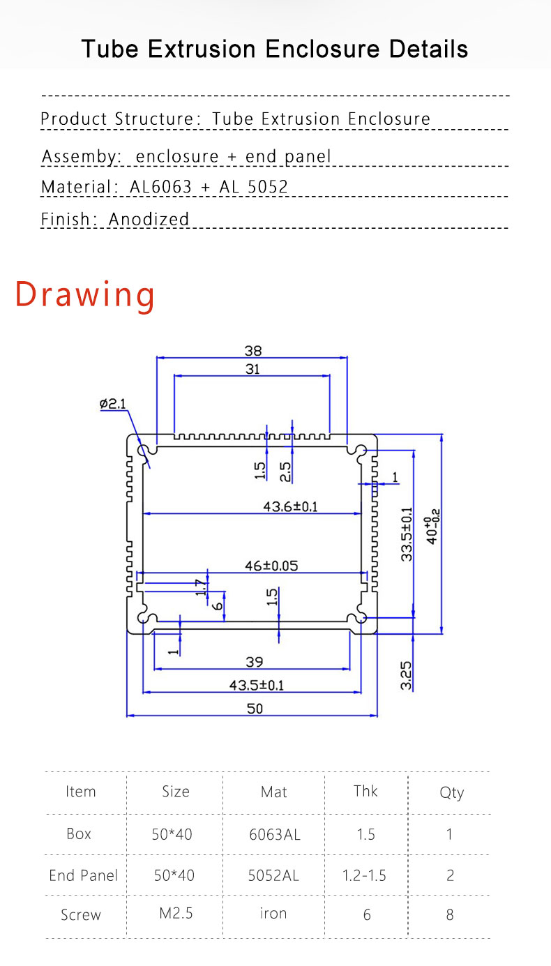 50*40aluminum extrusion, Electronic component Enclosure, anodizing aluminium enclosure