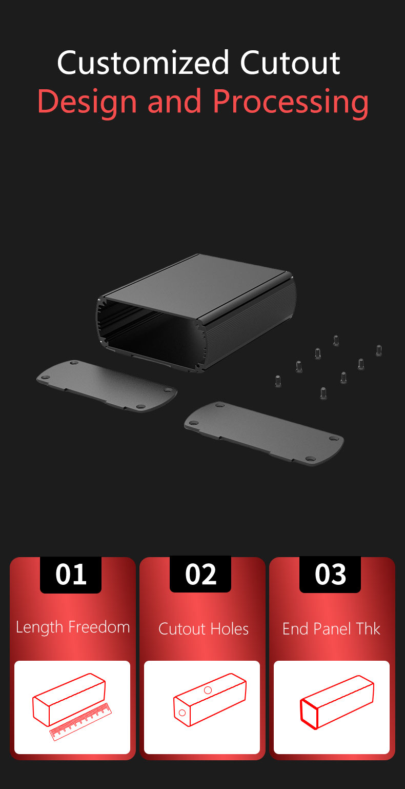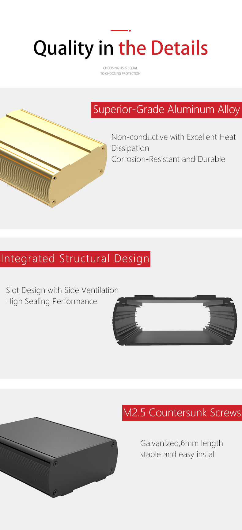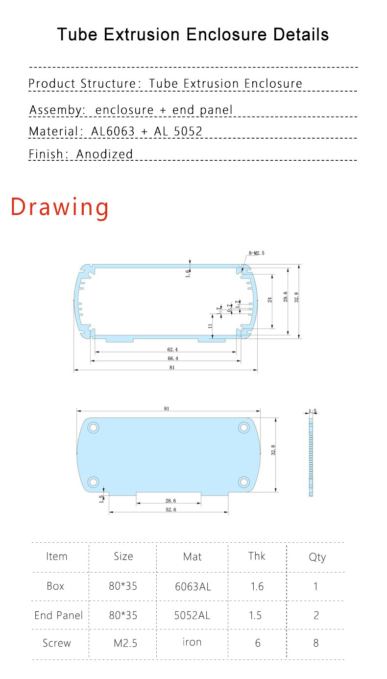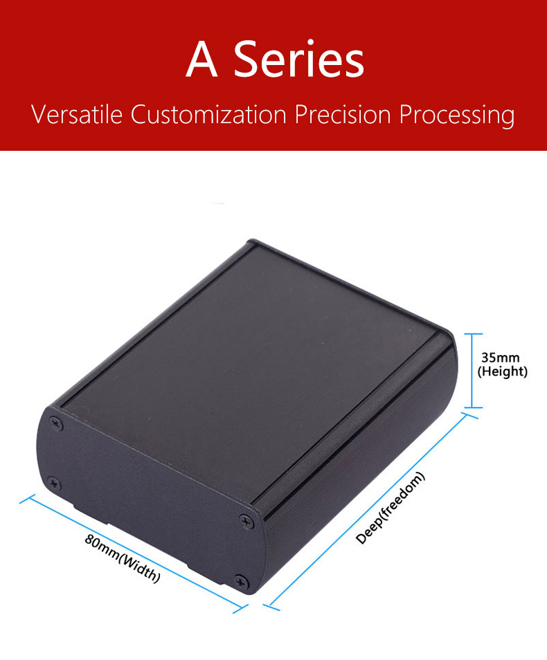 NO. AT047 Brand : PUMAY External dimensions: 80x35x L mm / 3.15'' x 1.38'' x L '' ( W*H-L ) Structure : Tube small metal enclosures for electronics Package weight: 0.2 KG Unit Price : 1-5 USD / set Place of origin : Foshan , Guangdong, China