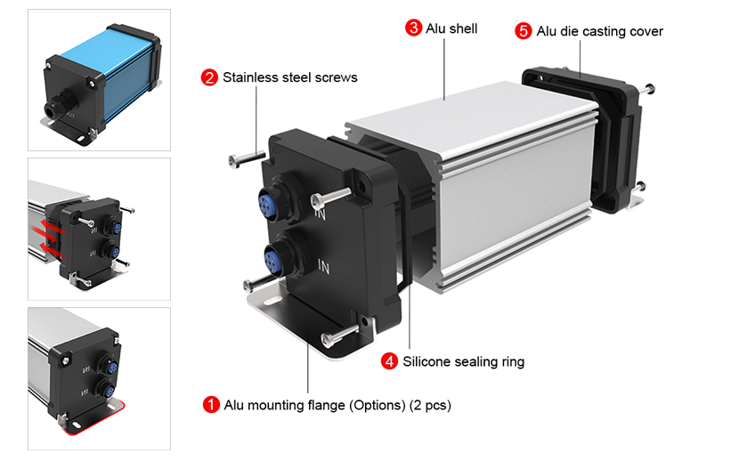 Aluminum extruded enclosure with Die-casting end panels. Stainless steel screw; Good seal screws design,